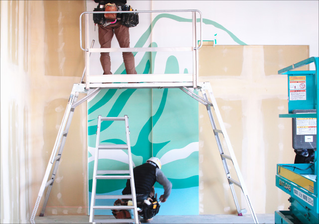 当社では住宅での内装工事業務を中心に、壁紙やグラフィック壁紙、クロス貼り、その他、床仕上げ工事やガラスフィルム工事、カーテン取付等幅広く業務を行っております。